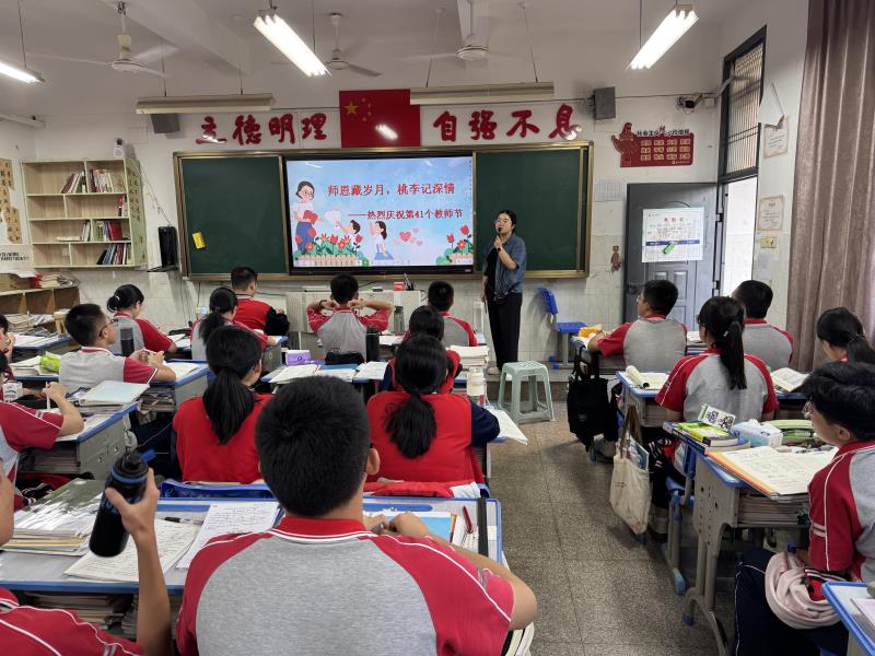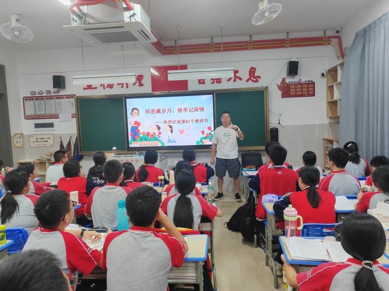 金秋九月,丹桂飘香。9月9日下午,我校各班教室洋溢着温馨的节日氛围,“师恩藏岁月,桃李记深情”教师节主题班会如期举行。 班会以“感恩”为主线,同学们用真挚的行动表达心意:亲手制作的贺卡上,稚嫩的字迹写满祝福;精心编排的诗朗诵《园丁颂》,道出“三尺讲台存日月,一支粉笔写春秋”的敬意;小品《老师的一天》生动再现了老师们备课、批改作业的辛劳,让全场动容。班主任李老师回忆与同学们共度的点滴,哽咽道:“你们的成长,就是最好的礼物。” 互动环节中,同学们争相分享与老师的暖心故事:数学课上老师用漫画讲解难题,运动会时班主任背着受伤同学就医……这些平凡瞬间,化作最动人的感恩告白。最后,全班齐唱《每当我走过老师窗前》,歌声里满是少年们纯粹的敬意。 此次班会不仅是一次节日庆祝,更是一堂生动的感恩教育课。同学们纷纷表示,将以更勤奋的姿态回报师恩,让这份深情在岁月中绽放。