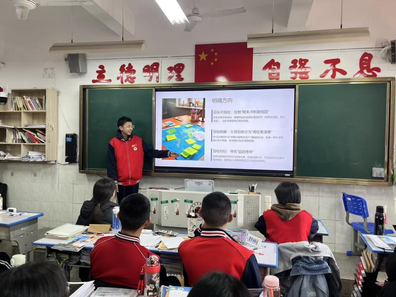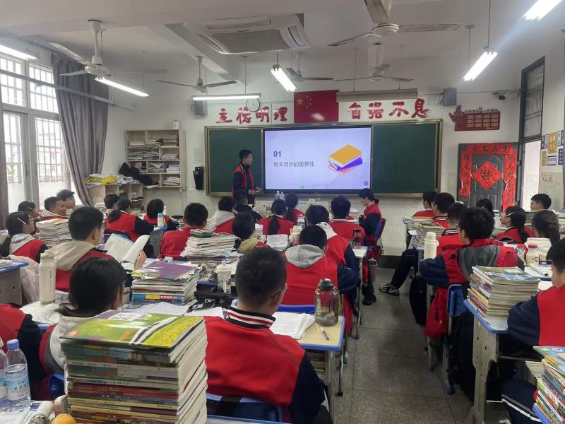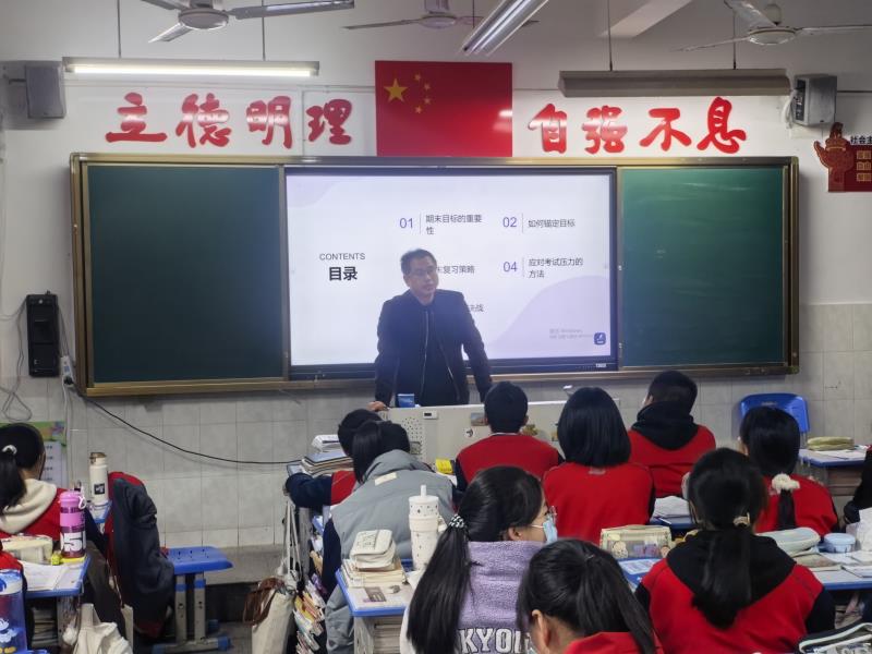 为激发学习热情,明确复习方向,我校召开"锚定目标 决战期末"主题班会。班主任主持,通过目标分享、方法交流、团队互助及宣誓动员等环节,为期末冲刺凝聚力量。 班会伊始,"目标树"环节中,同学们写下包含总分目标、学科突破方向的复习计划并粘贴于"成长墙"。班主任强调目标需符合SMART原则,班级整体目标为年级平均分提升5分,及格率100%,优秀率突破40%。 学霸代表分享实用方法:学习委员的"三色笔记法"、数学状元的"错题归因表"、英语课代表的"碎片化时间管理法",老师补充"四轮复习法"建议,帮助同学们科学规划复习。 此次班会明确了复习方向,凝聚班级力量,为期末备考注入强劲动力,同学们将以昂扬斗志迎接期末考试。