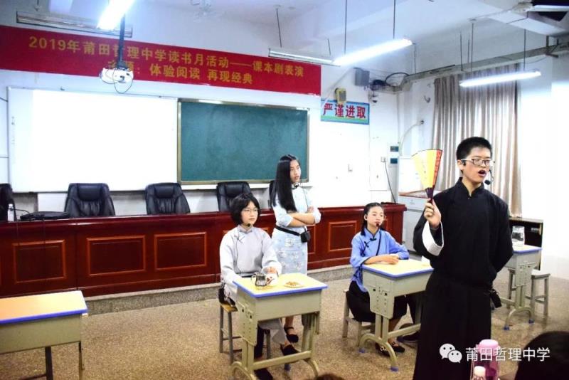 启动仪式 二、演讲、朗诵与课本剧表演齐飞 1.2019年4月3日晚6:30,由我校高一年段语文备课组承办的,以“阅读经典,传承文化”为主题的 在初中部教学楼一楼主考室举行。市教育局干部徐秋海、哲理中学陈培基校长、许国平副校长、团委柯强强书记、教研室董立群主任等领导莅临现场观看比赛,语文组范秀植、林婷、张燕花、陈素贞等老师和校学生会主席陈洋洋同学担任了比赛的评委。 在高一年段各班级内部选拔的基础上,共有14位选手参加本次演讲比赛的决赛。在比赛中,选手们以《阅读经典,浸润人生》、《扬起经典的风帆》、《经典照亮前路》等为演讲题目,进行了精彩的演讲,深情地诉说着自己与经典的缘分。经过一个半小时的比拼,黄伟彬、施可蓉、兰斌斌三位同学获得一等奖;吴姗、徐健、陈吉、蔡怡欣、许晓萱五位同学获得二等奖;黄开阳、林俊豪、郭哲楠、杨黄羽、蔡舒杰、林天昊六位同学获得三等奖。