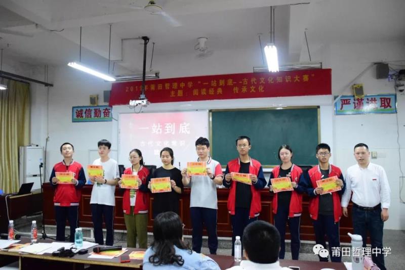 5.成功举办古代文化大赛 2019年4月22日晚6:30,由我校高二年级语文备课组承办的,以“阅读经典,传承文化”为主题的“一站到底——古代文化知识大赛”在初中部教学楼一楼主考室举行。市教育局干部徐秋海、哲理中学党总支副书记黄润漪、校长助理兼教务处主任祁义生莅临现场观看、指导比赛,并为获奖选手颁奖。经过“两两PK赛”、“守擂显身手”、“车轮大对决”、“智勇挑站神”等四个环节的层层角逐,最终高二(5)班郑恒杰同学获得特等奖,高二(3)班林怡珊等4位同学获得一等奖,高二(1)班郑宇希等5位同学获得二等奖,高二(6)班吴炜圣等8位同学获得三等奖。